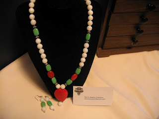 White, Green, Silver Beads Accented by Deep Red Beads. 20". Lovely for fall...